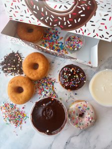 This kit includes ring doughnuts, 2 glazes (vanilla and chocolate, of course!) and assorted toppings.